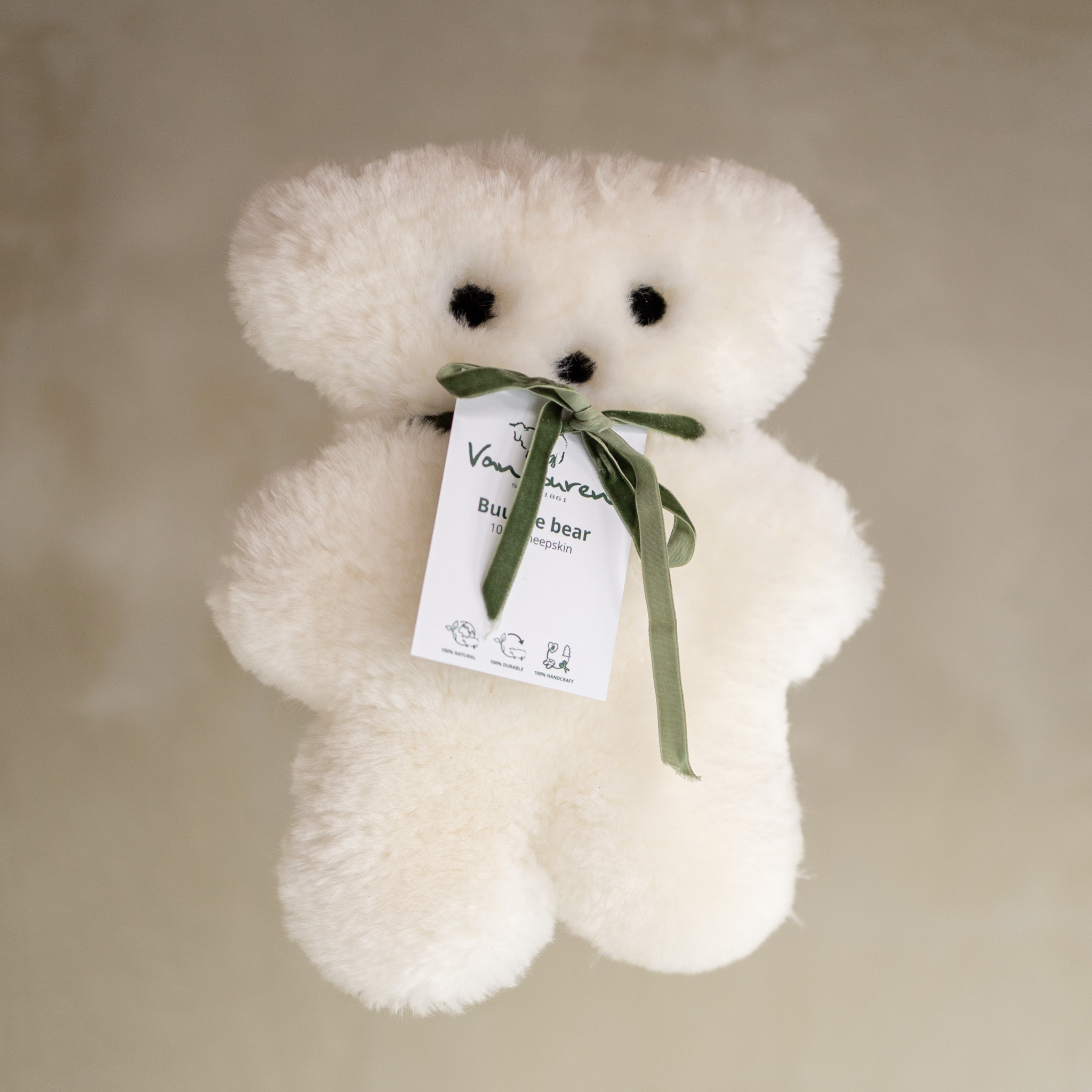 Da Wolle ein Naturprodukt ist, gleicht kein Fell dem anderen. Jeder Buurtje Bär ist daher ein echtes Unikat mit eigener Ausstrahlung. Passend zu Ihren Vorlieben oder dem Stil des Kinderzimmers ist die Kollektion in verschiedenen Ausführungen erhältlich: klassisches Naturweiß oder ein warmer Kastanienbraunton.