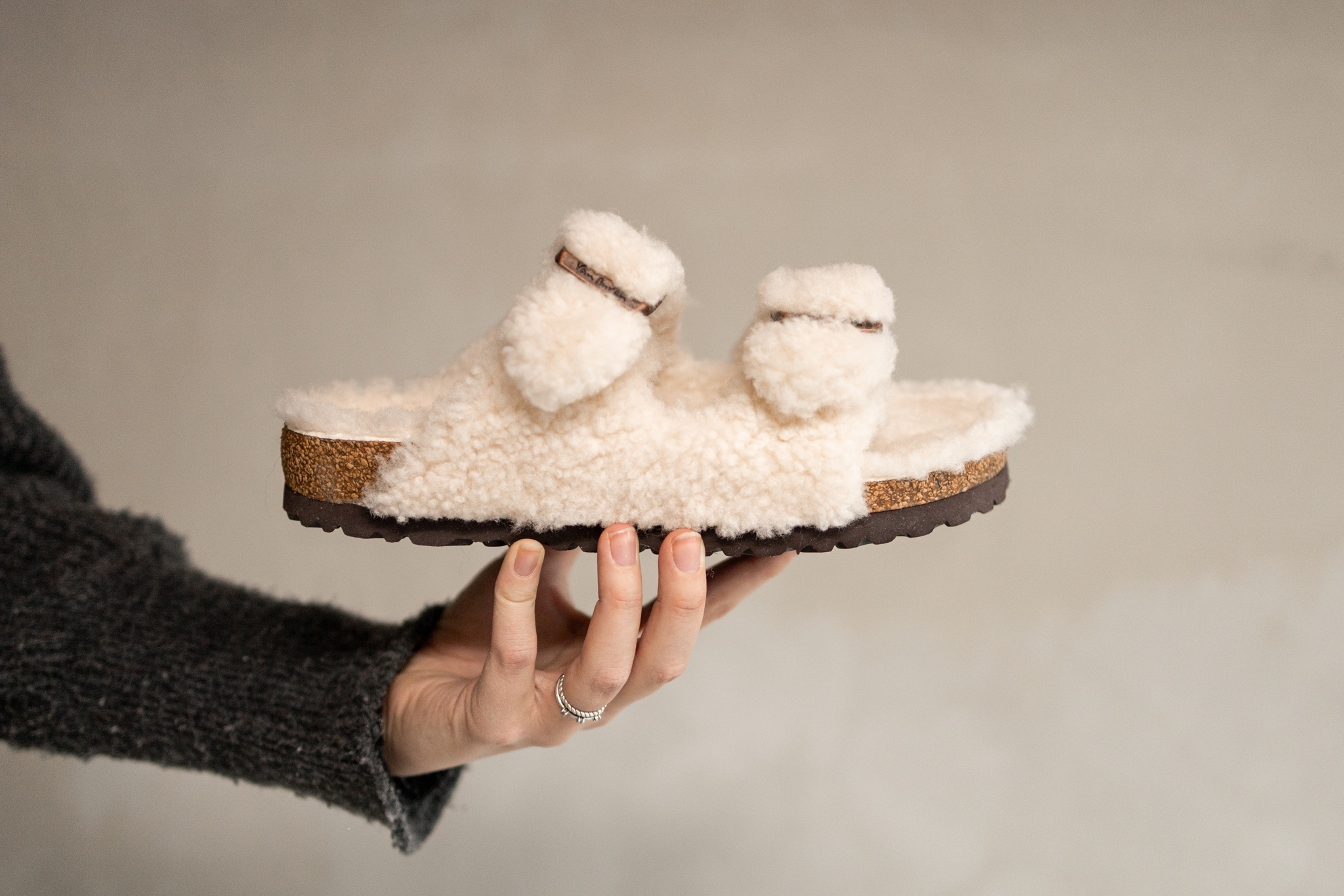 Das Off-White Crossbreed-Schaffell auf dem Fußbett und den Riemen sorgt für ein konstantes Fußklima. Wolle besitzt die natürliche Eigenschaft, die Temperatur zu regulieren: Sie hält die Füße bei Kälte warm und wirkt an wärmeren Tagen angenehm kühlend. Die atmungsaktive Struktur leitet Feuchtigkeit effektiv ab und hält die Füße trocken. Zudem regt die Textur des Schaffells die Durchblutung an und wirkt Ermüdungserscheinungen entgegen.