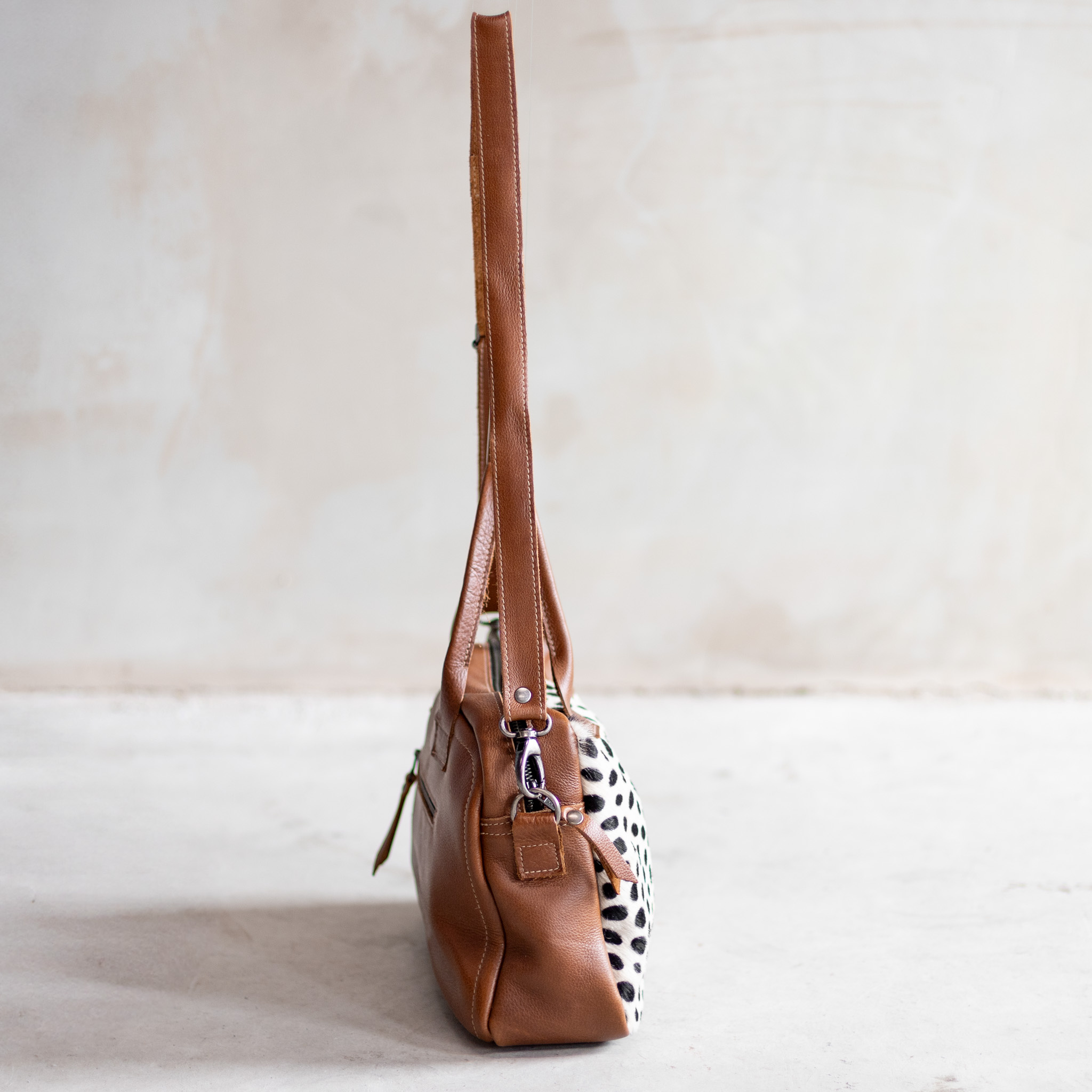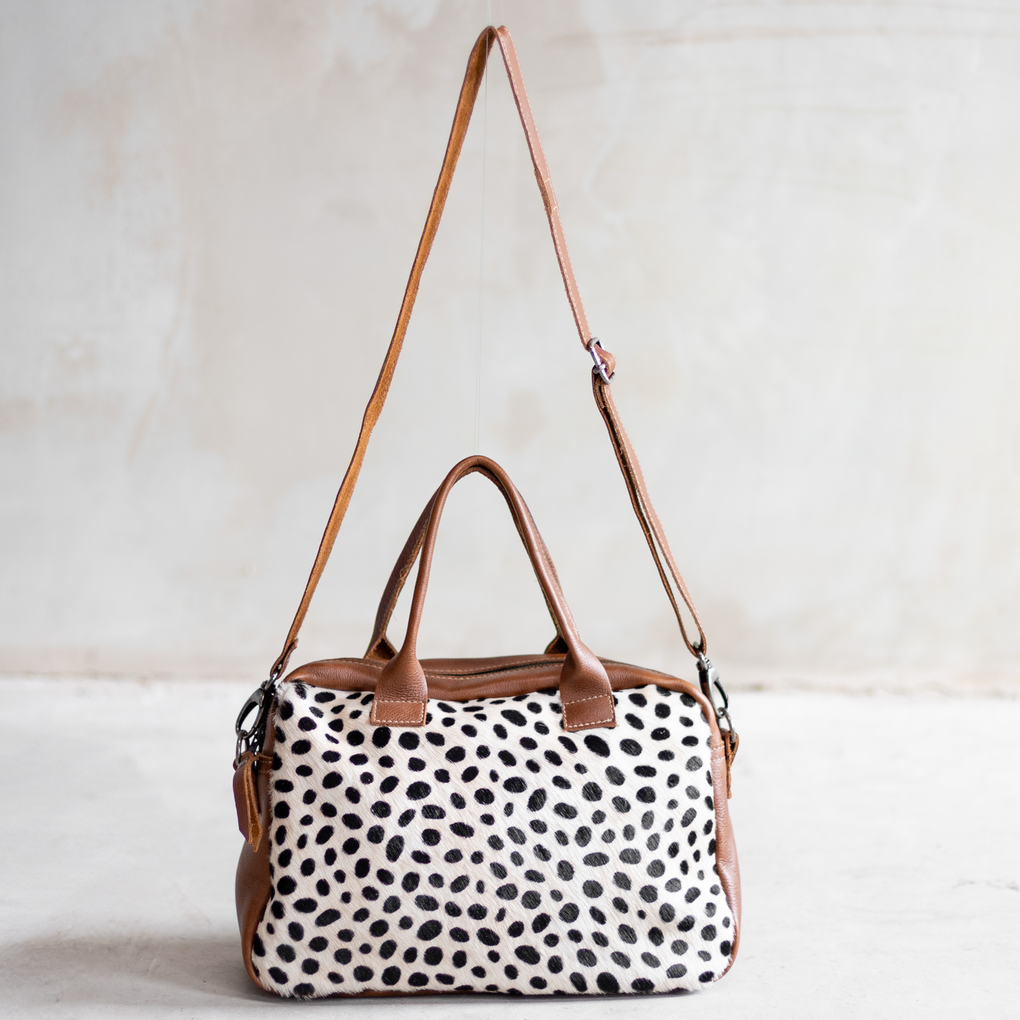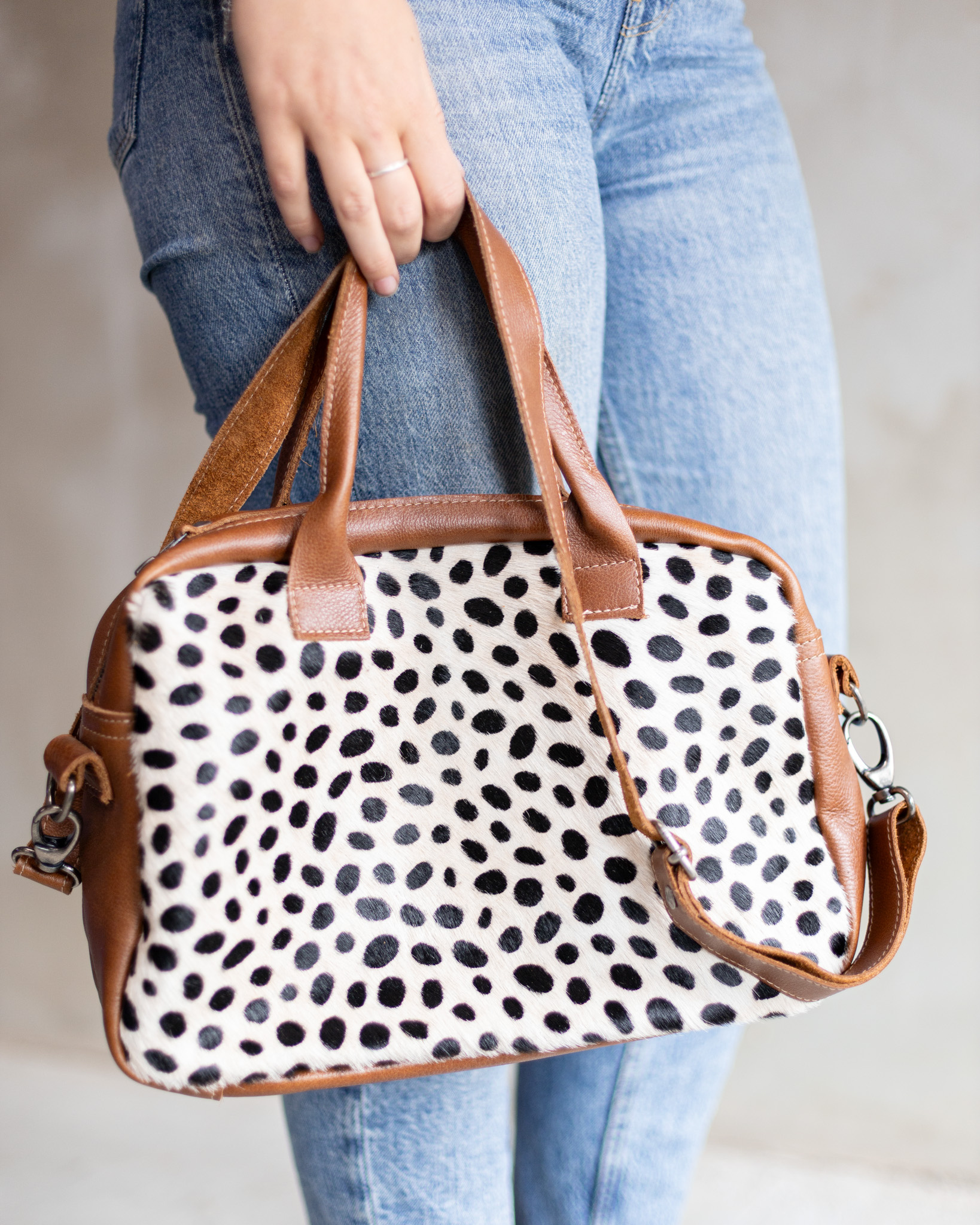 Das bedruckte Rindsleder macht die Tasche hip und einzigartig. Sie ist groß genug für einen Tagesausflug, die Arbeit oder das Studium!