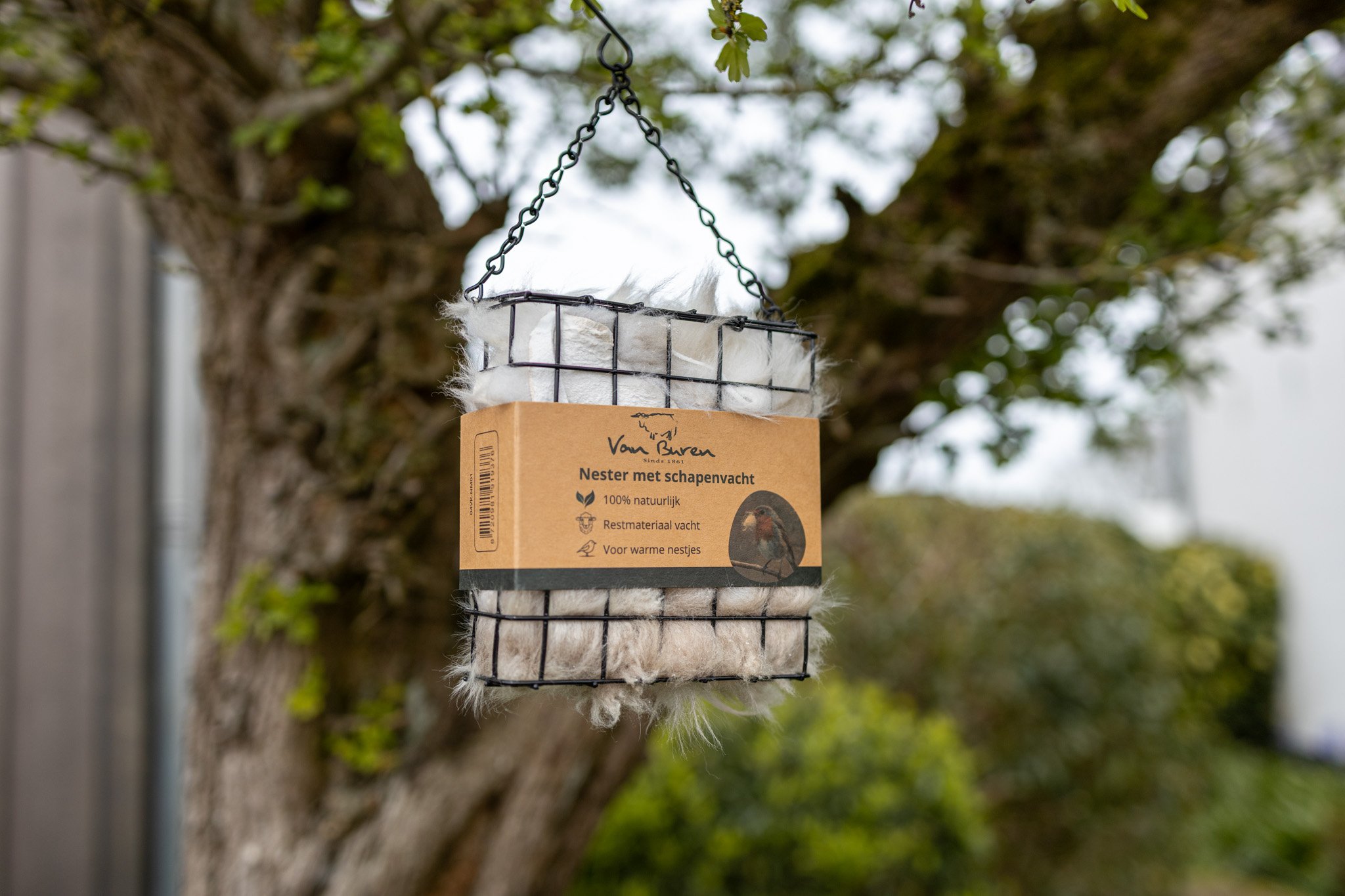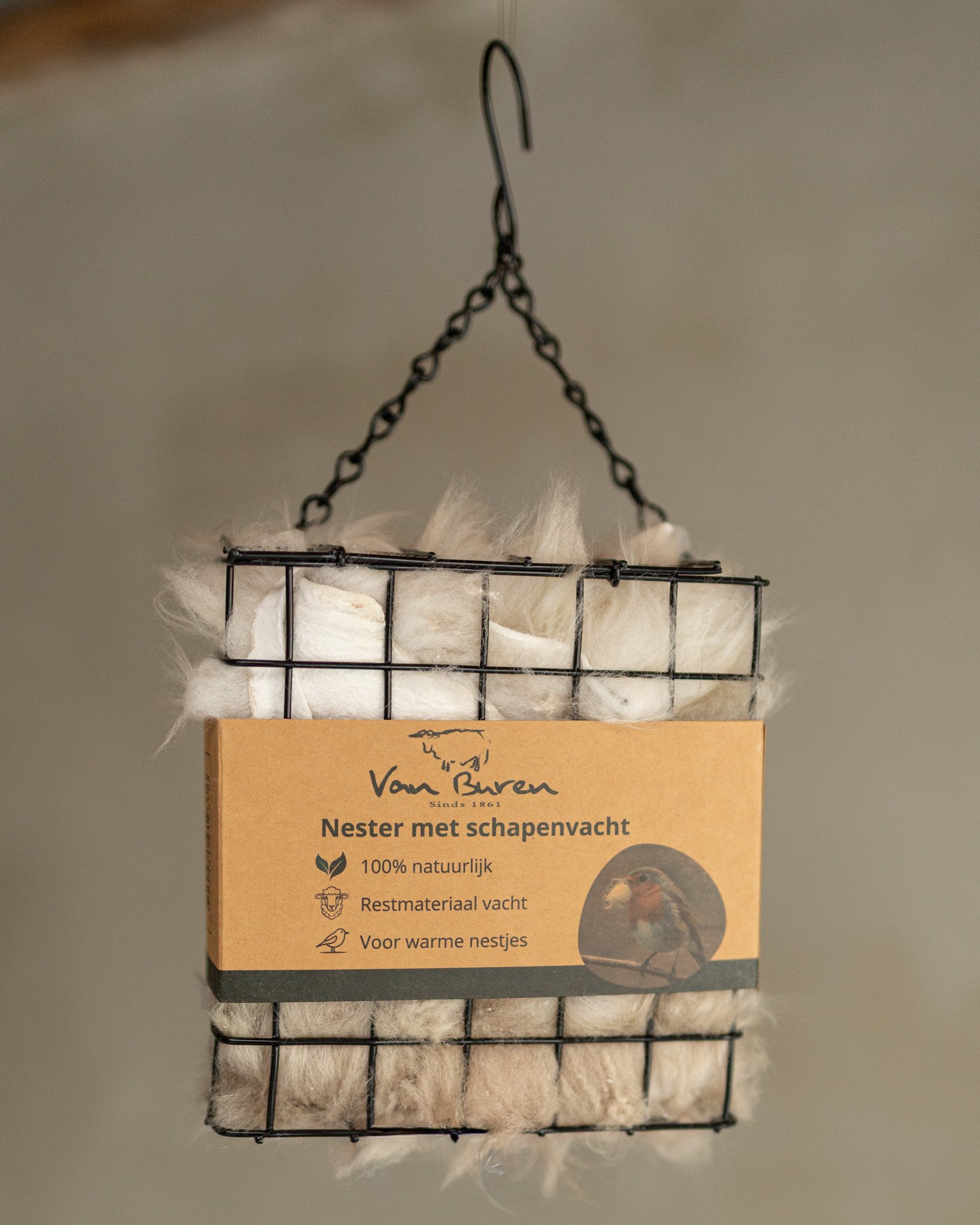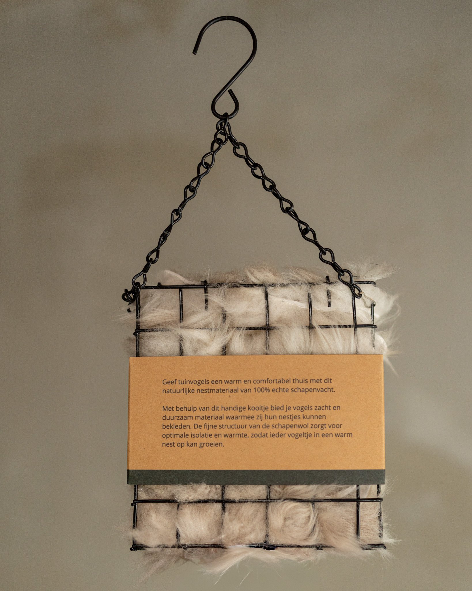 Wolle und Schaffell sind schöne Materialien, die sich durch ihre weiche, warme und luftige Struktur gut als Nistmaterial eignen. Genau diese Eigenschaften machen sie passend für den Einsatz im Nest. Das Material fühlt sich natürlich an und passt gut zu dem, was du in diesem Halter anbieten möchtest: etwas Weiches, das in der Nistsaison eine wertvolle Ergänzung sein kann.