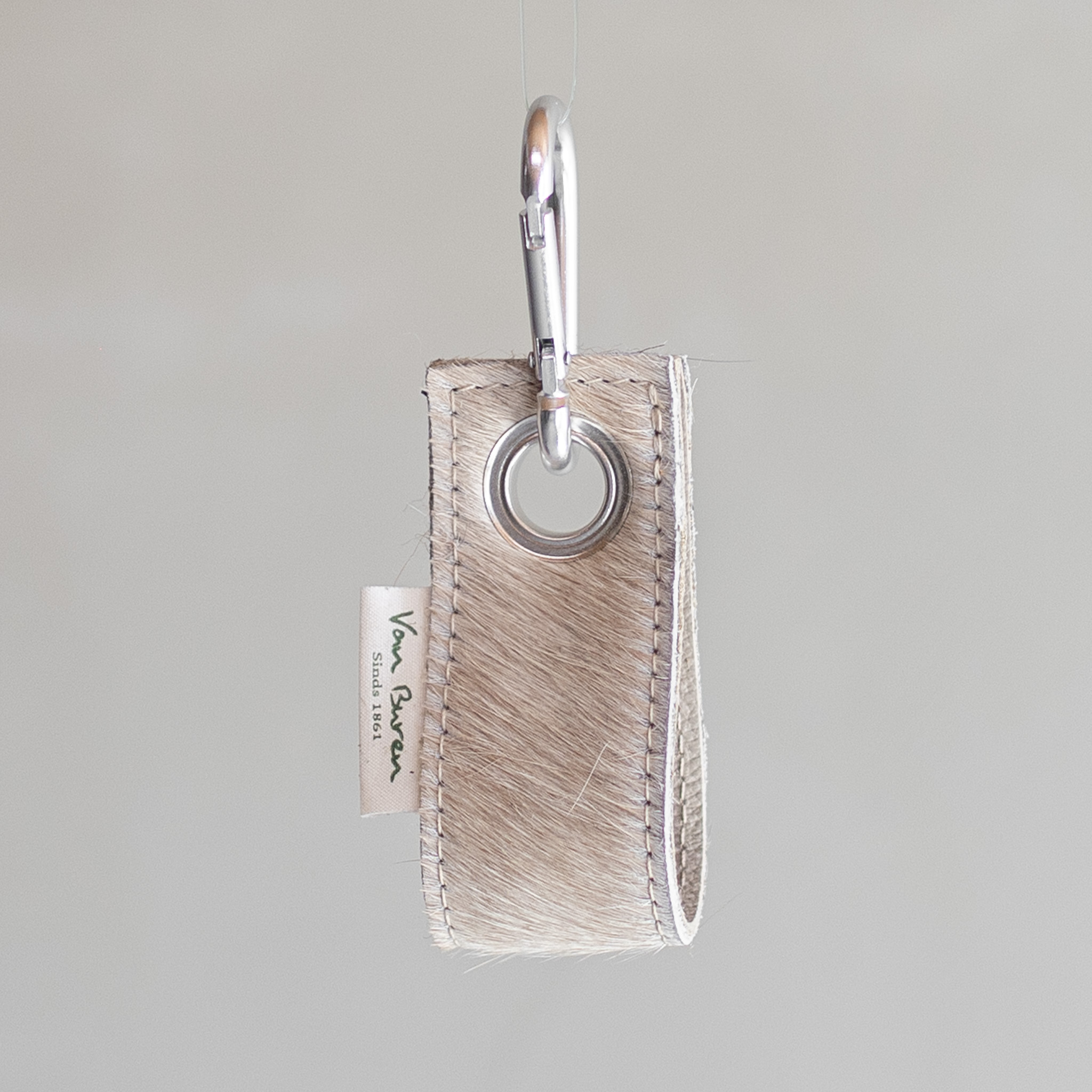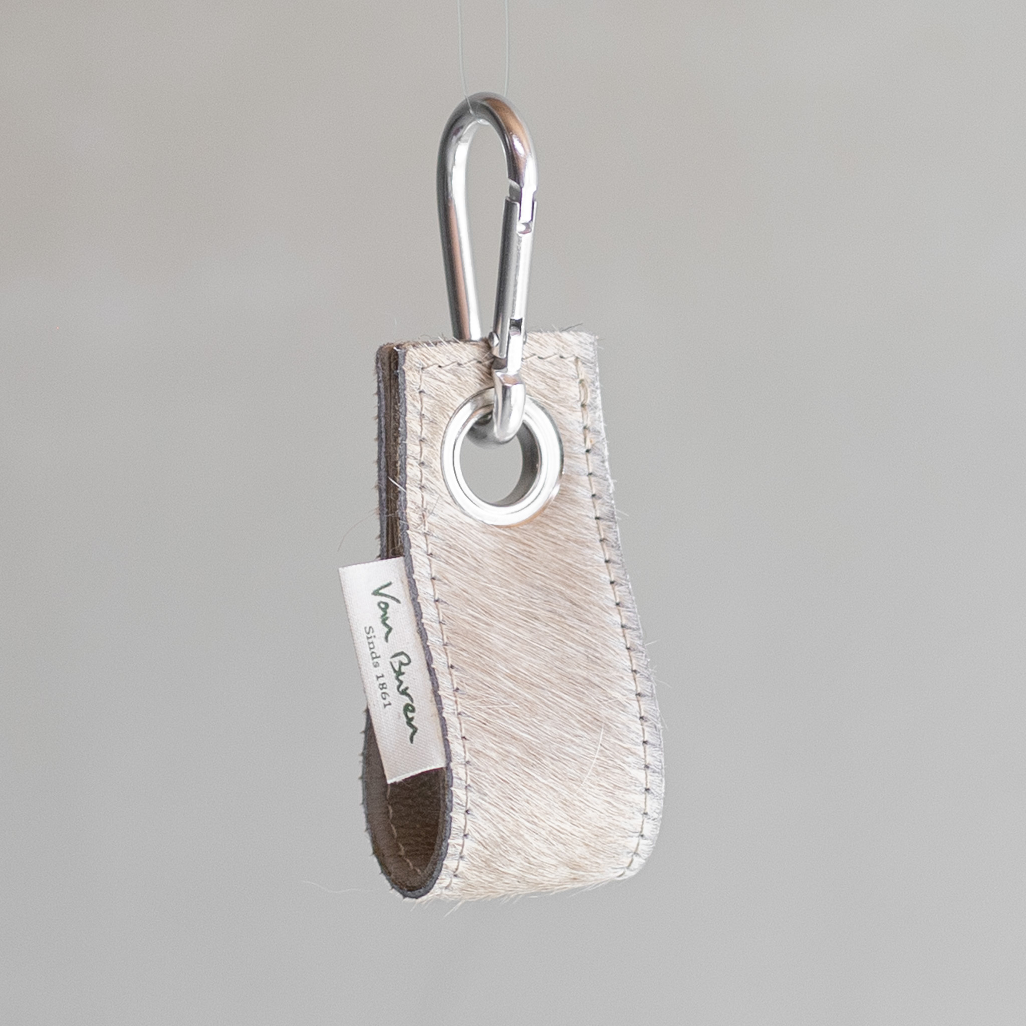 Niedlicher Schlüsselanhänger aus beigem Rindsleder. Der Schlüsselring hat einen Karabiner und einen Schlüsselring, um alle Schlüssel zusammen zu halten.