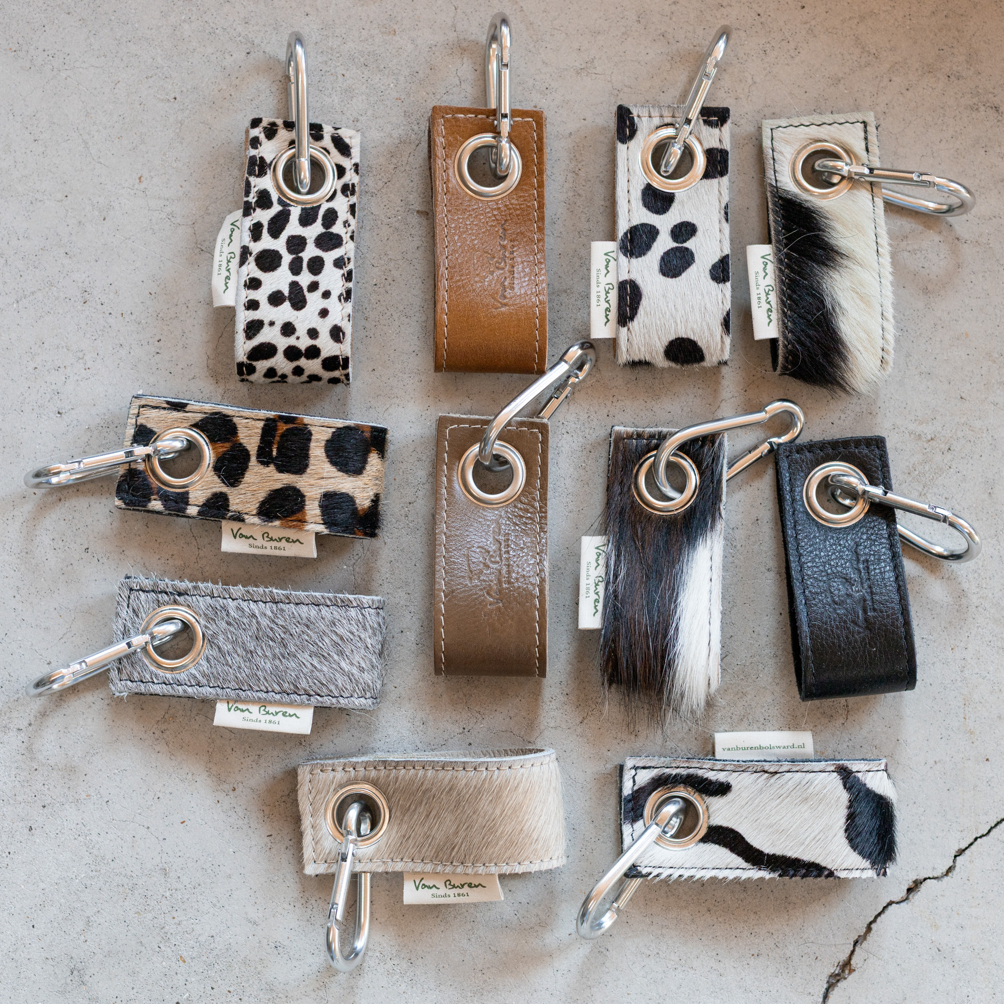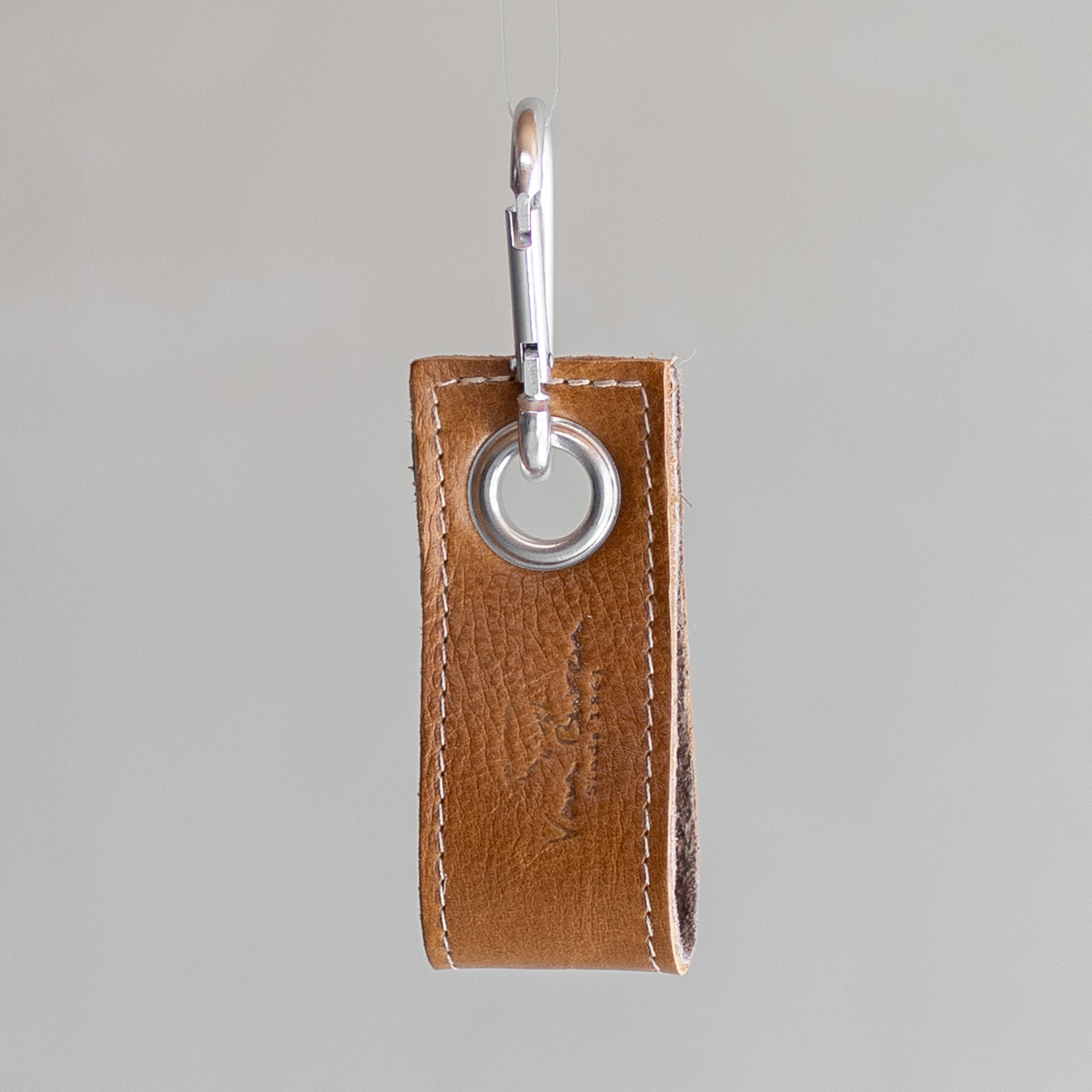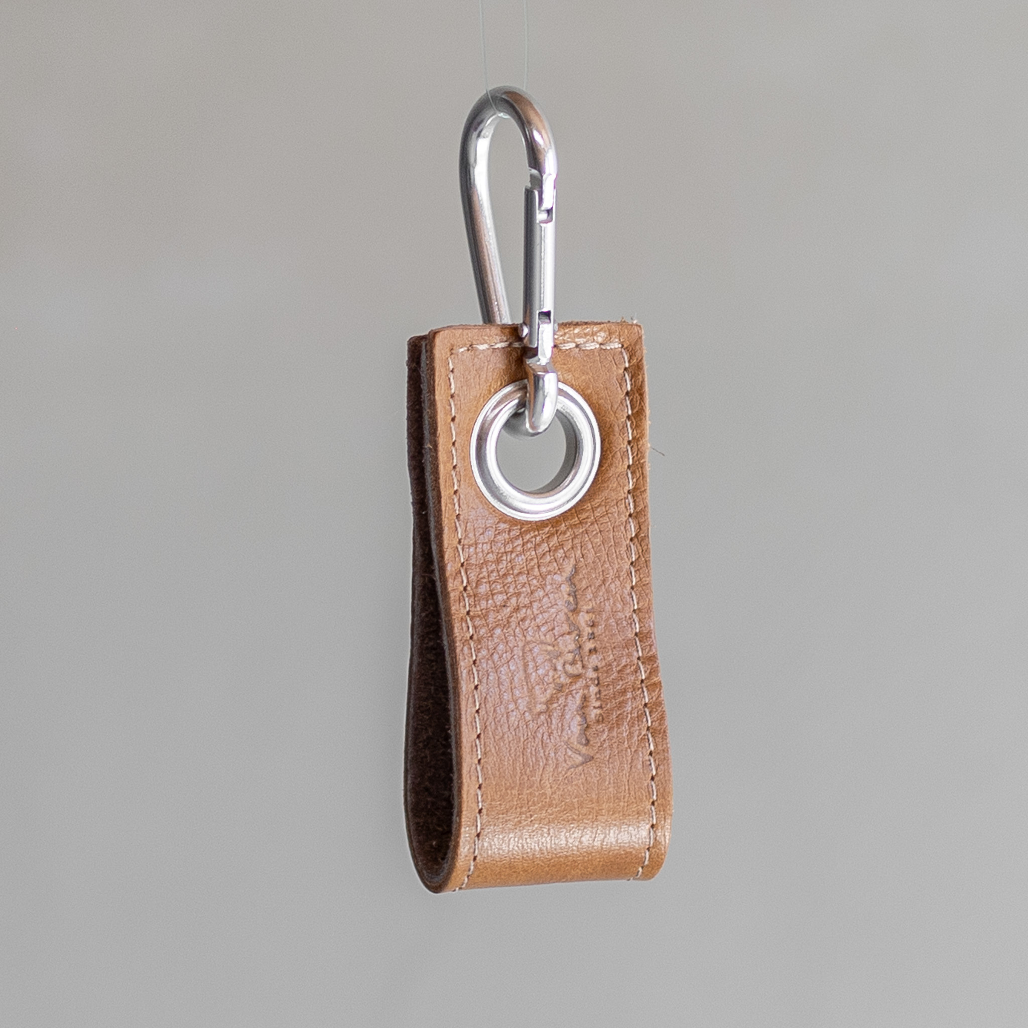 Niedlicher Schlüsselanhänger aus beigem Rindsleder. Der Schlüsselring hat einen Karabiner und einen Schlüsselring, um alle Schlüssel zusammen zu halten.
