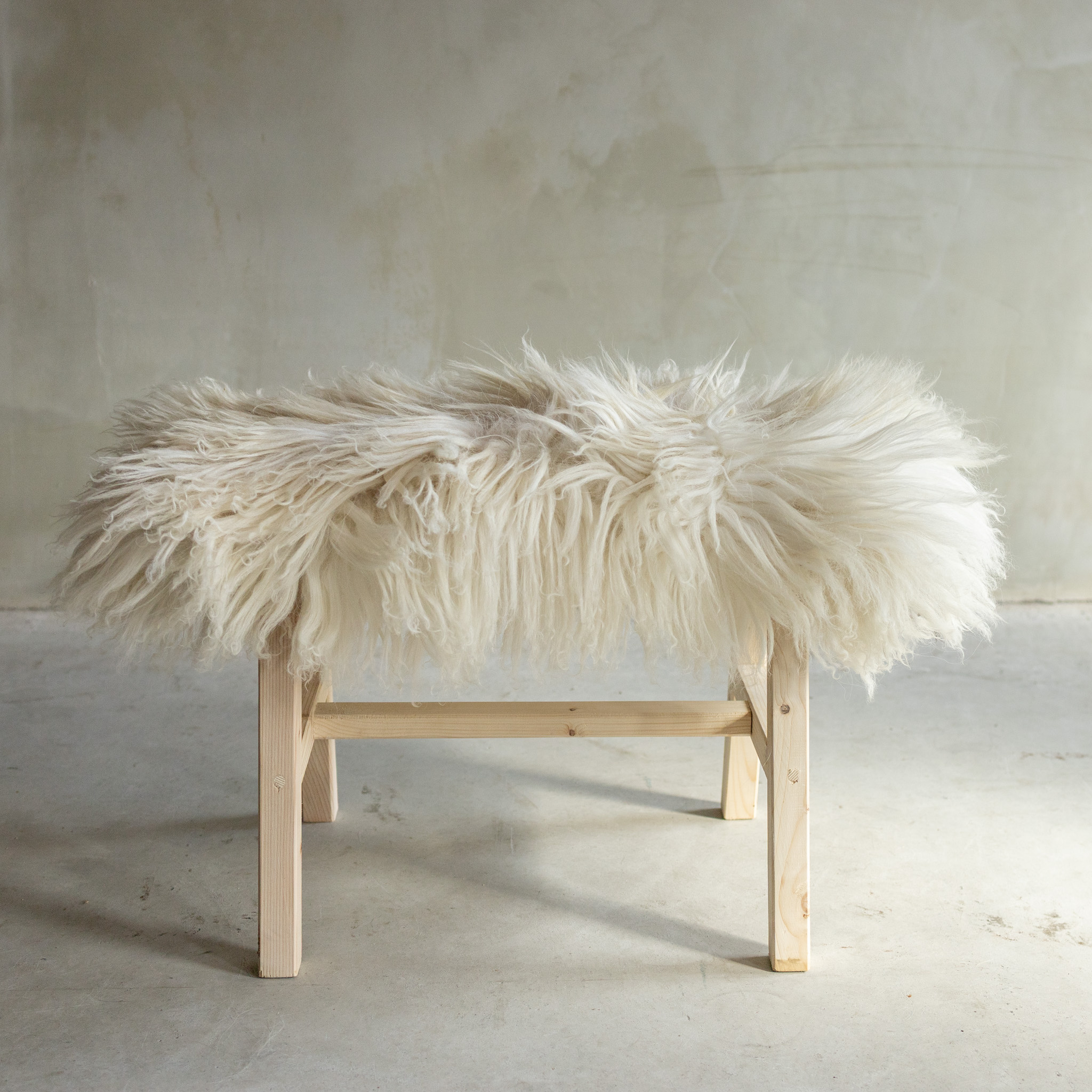 Das separat fotografierte (BNK-15) hochwertige Holz-Bänkchen hat eine Größe von 70x20x46 cm und ist mit lockigem Bergschaf bezogen. Es verbindet ein stabiles Holzgestell mit der natürlichen Weichheit des Fells und sorgt so für eine warme und einladende Ausstrahlung in deinem Zuhause.