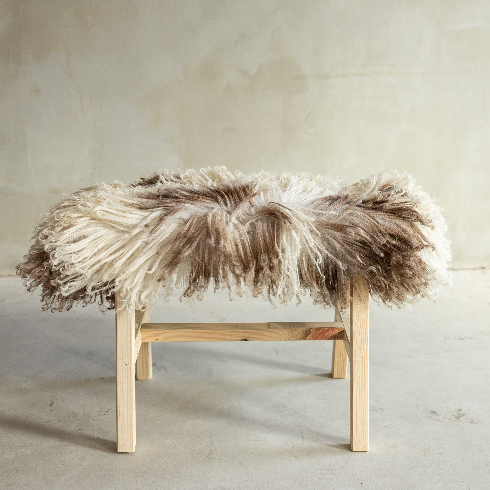 Das separat fotografierte (BNK-36) hochwertige Holz-Bänkchen hat eine Größe von 70x20x46 cm und ist mit lockigem Bergschaf bezogen. Es verbindet ein stabiles Holzgestell mit der natürlichen Weichheit des Fells und sorgt so für eine warme und einladende Ausstrahlung in deinem Zuhause.
