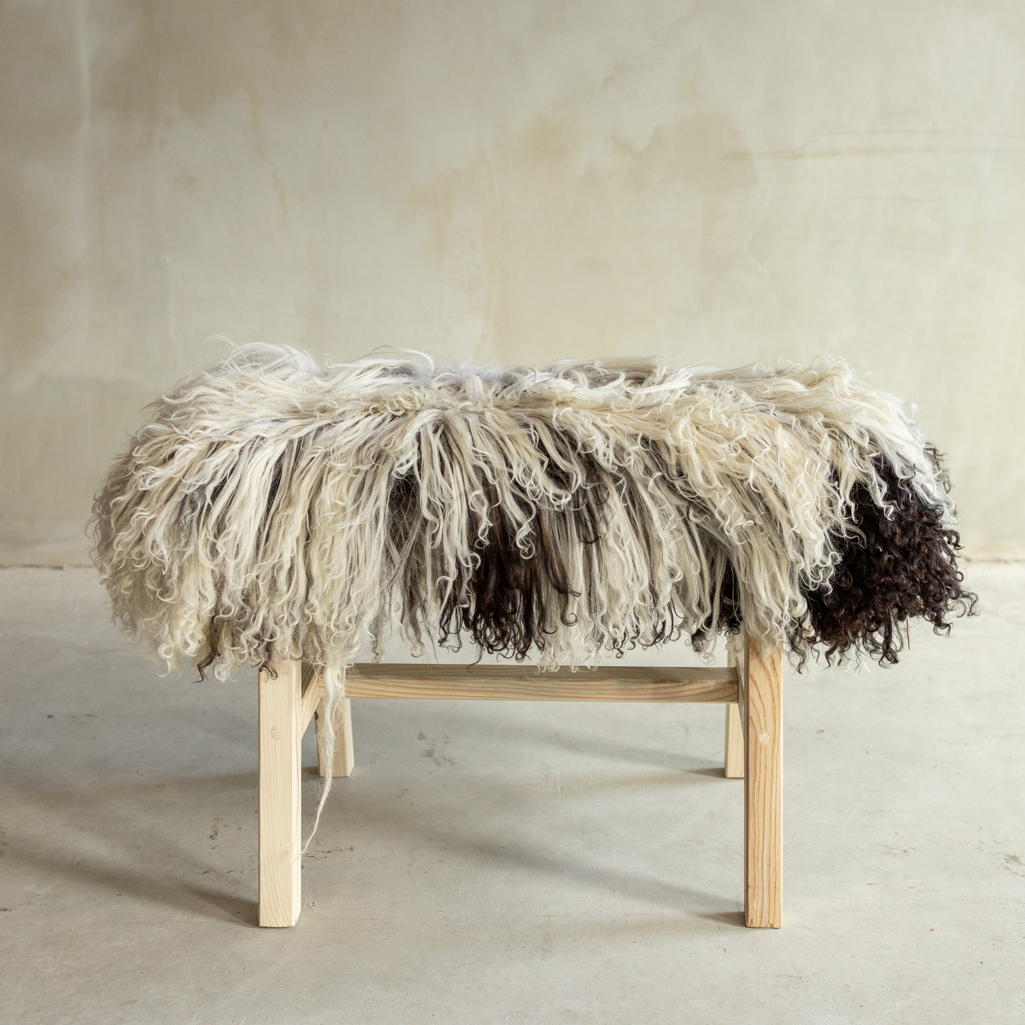 Das separat fotografierte (BNK-38) zeitlose Holz-Bänkchen hat eine Größe von 70x20x46 cm und ist mit lockigem Bergschaf bezogen. Es verbindet ein stabiles Holzgestell mit der natürlichen Weichheit des Fells und sorgt so für eine warme und einladende Ausstrahlung in deinem Zuhause.