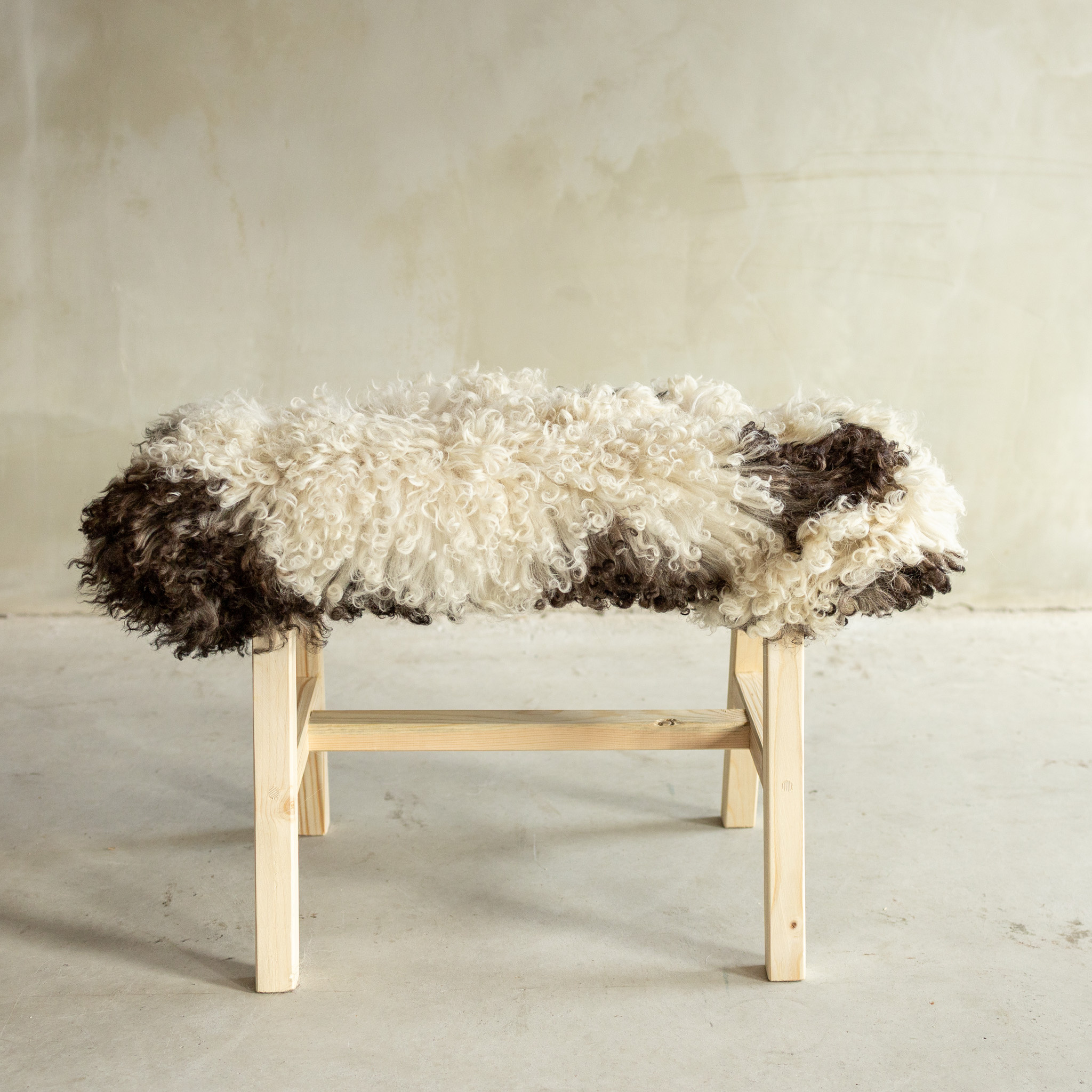 Das separat fotografierte (BNK-42) zeitlose Holz-Bänkchen hat eine Größe von 70x20x46 cm und ist mit lockigem Bergschaf bezogen. Es verbindet ein stabiles Holzgestell mit der natürlichen Weichheit des Fells und sorgt so für eine warme und einladende Ausstrahlung in deinem Zuhause.