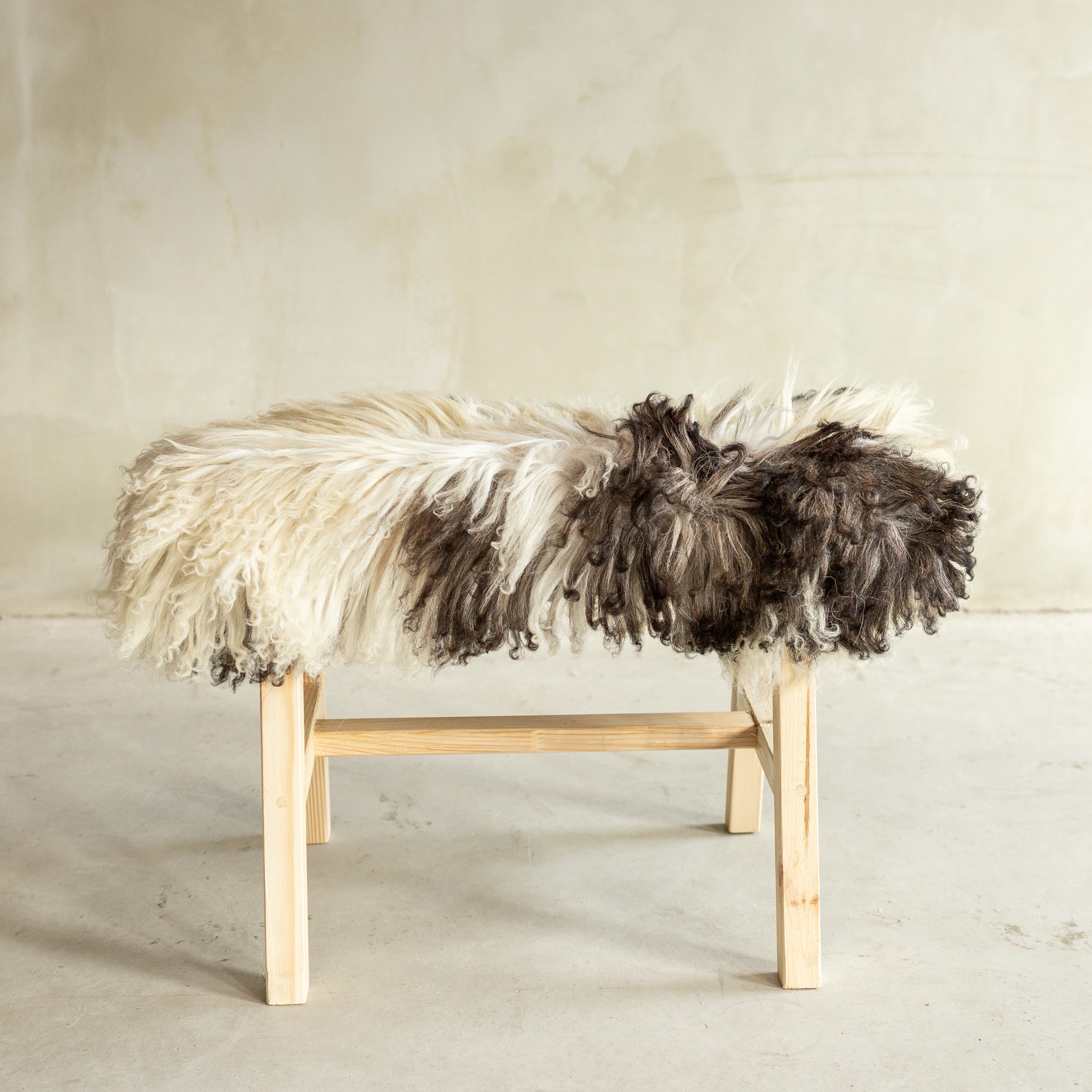 Das separat fotografierte (BNK-44) stilvolle Holz-Bänkchen hat eine Größe von 70x20x46 cm und ist mit lockigem Bergschaf bezogen. Es verbindet ein stabiles Holzgestell mit der natürlichen Weichheit des Fells und sorgt so für eine warme und einladende Ausstrahlung in deinem Zuhause.