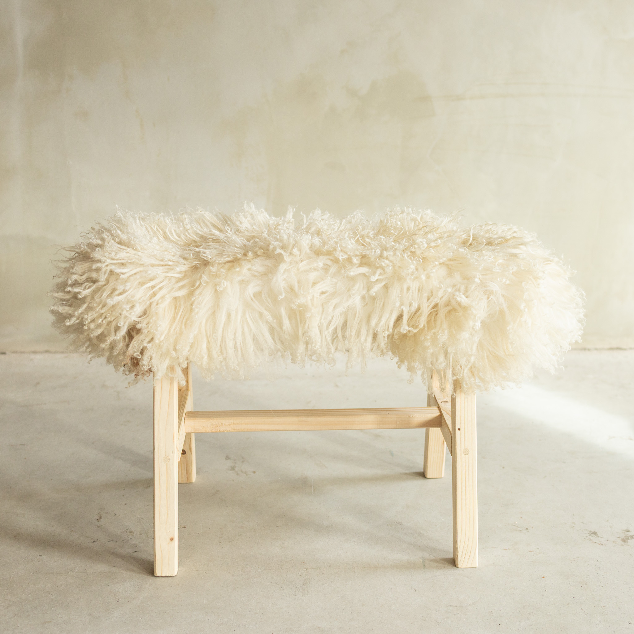 Separat Fotografiert Hölzernes Bänkchen mit Schaffell - Lockig/Bergschaf - 70x20x46 cm (LxBxH) - BNK-45